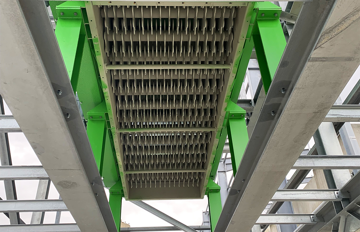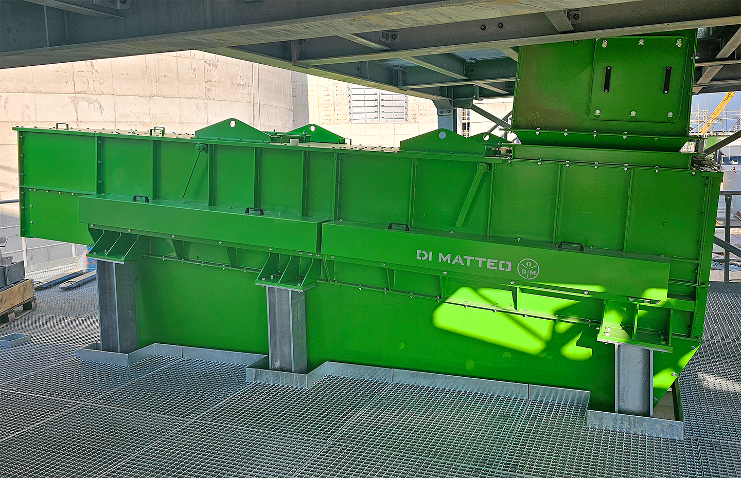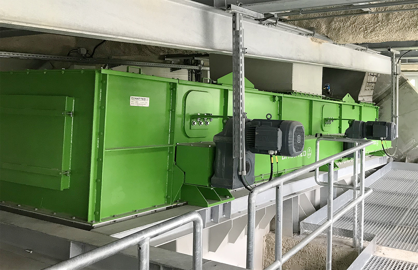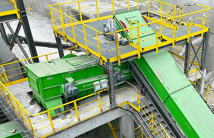 The DI MATTEO DiscSCREEN separates oversize particles from the material stream by means of rotating screening discs. Fines pass through defined disc distances, while coarse material is discharged separately. The separation principle supports uniform throughput and reduces the risk of blockages or damage to downstream equipment.